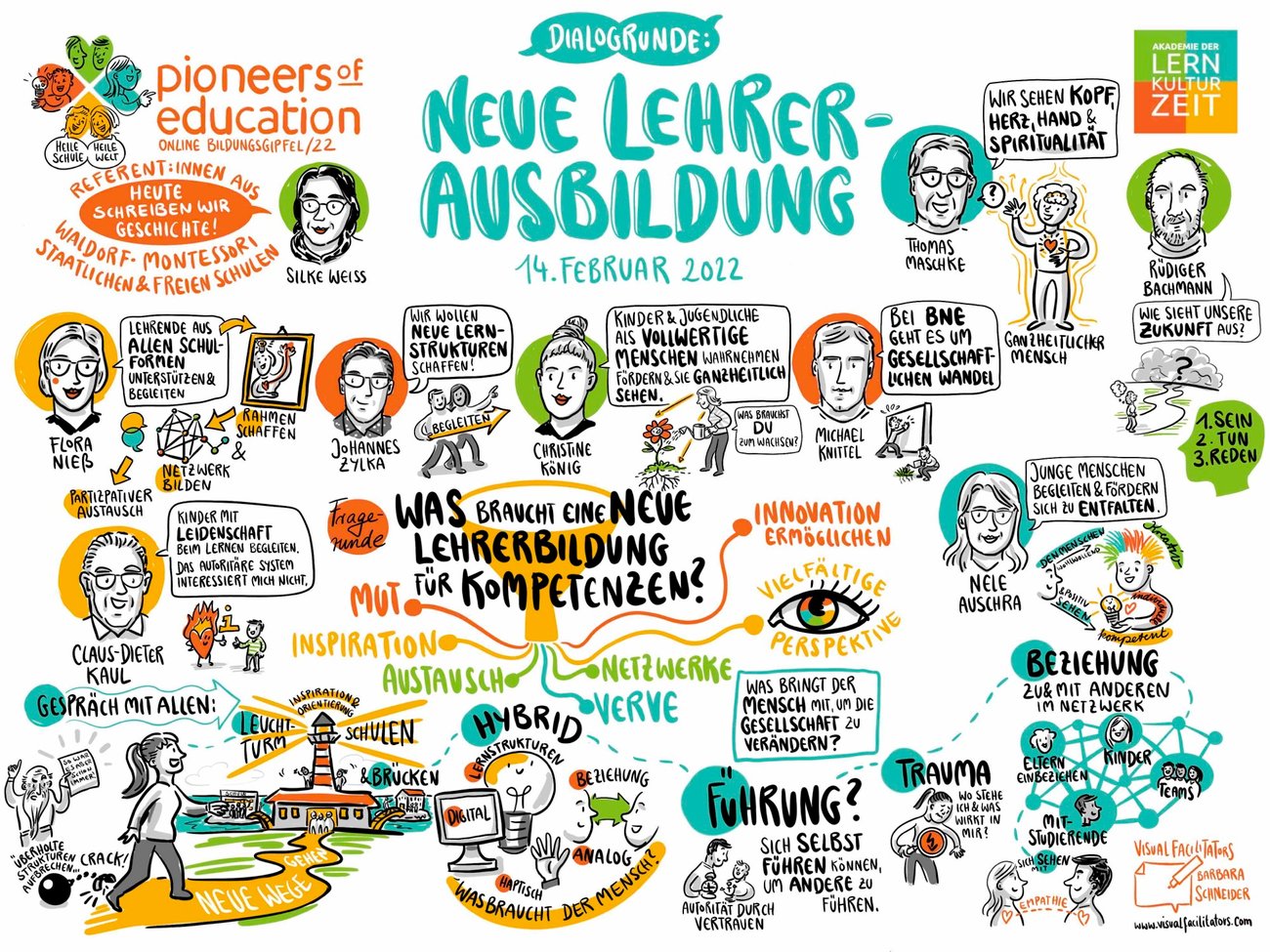 Hier ist das Graphic Recording des Dialogabends zur neuen Lehrerbildung. Auch heute Abend und bei den anderen Dialogabenden werden wir begleitet von Graphic Facilitators.