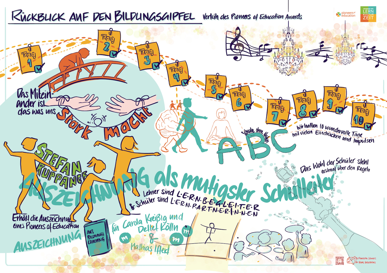 Den stimmungsvollen Galaabend mit der Preisverleihung von zwei Pioneers of Education Awards hat Franziska Schwarz von den Visual Facilitators für uns grafisch festgehalten. >>Hier kannst Du den Abend nochmal Revue passieren lassen.